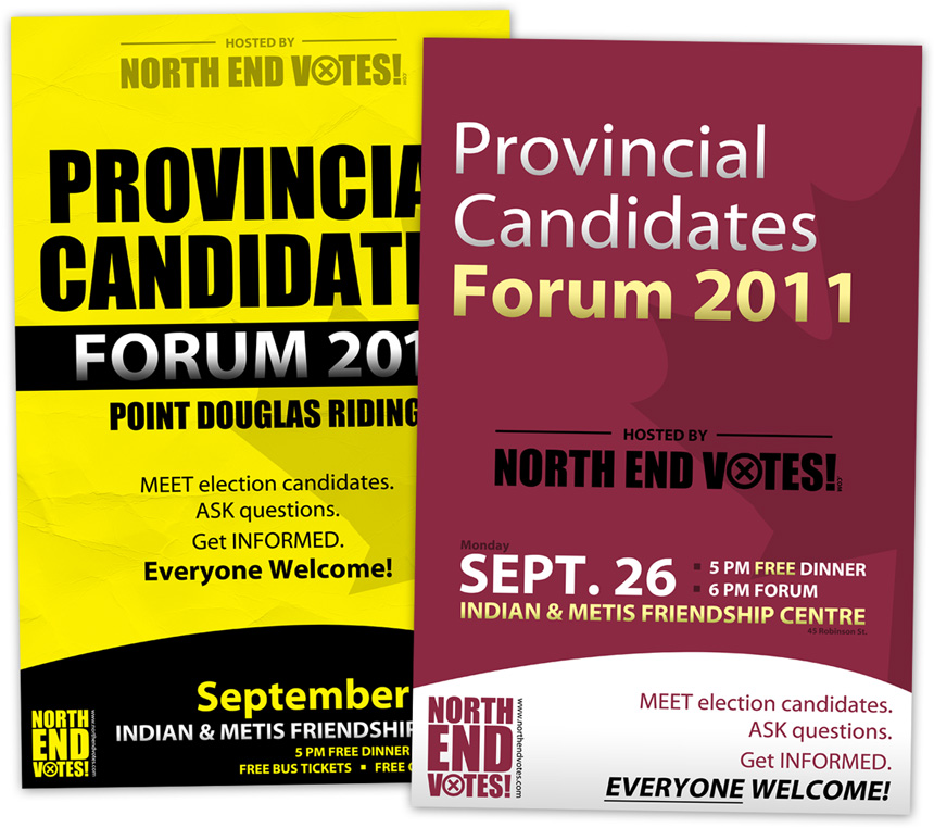 The North End Community Helpers Network (NECHN) approached me to develop their 2011 Get Out the Vote campaign. It was geared towards members of Winnipeg’s North End Community to empower voters with election information, including a community forum discussion with political riding leaders.