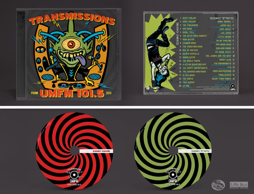 We were privileged to be asked to undertake the design work for the Transmissions from UMFM 101.5 FM compilation series for UMFM’s very first Pledge-O-Rama campaign. UMFM is one of Winnipeg’s few indie radio stations that focuses on local, independent and – most importantly – Canadian artists. Illustrations by the ever-talented Darren Merinuk.